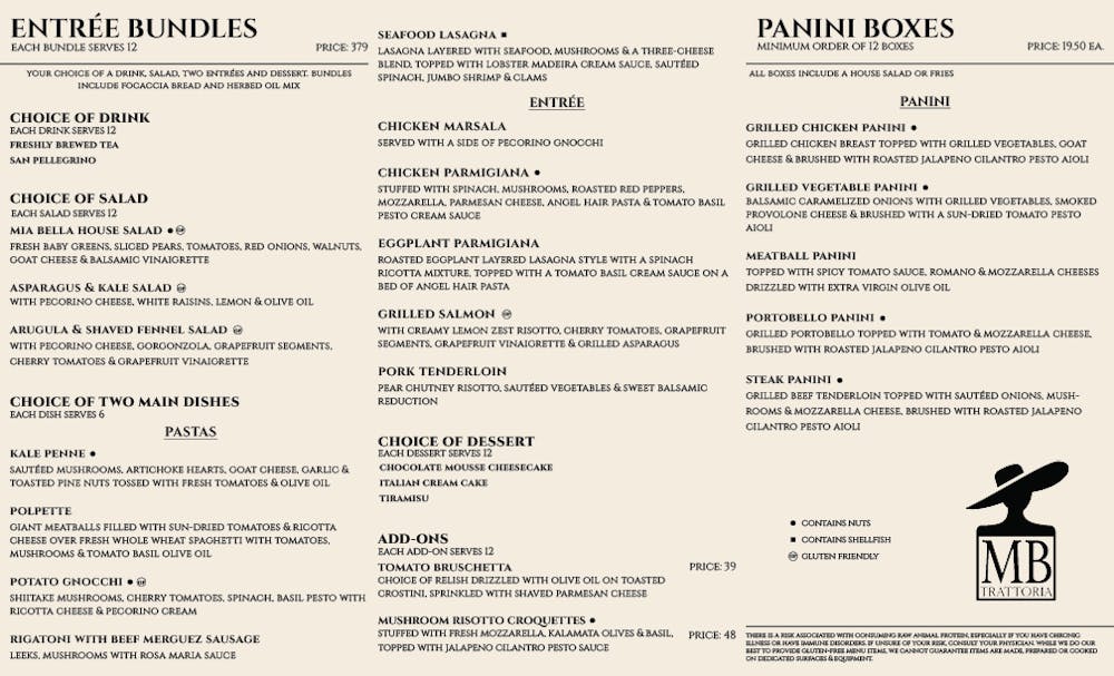 Let Mia Bella Trattoria cater your next event. Treat your guests to a variety of traditional Italian classics with an American Twist.
