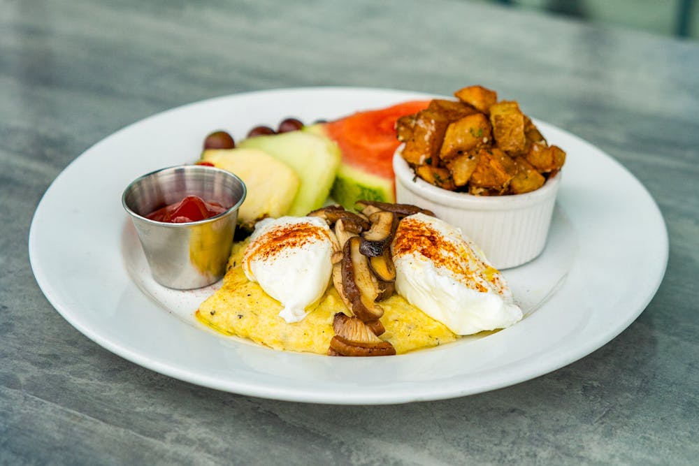 Truffled Wild Mushroom Polenta Benedict – grilled polenta, wild mushrooms, poached eggs, hollandaise, and a drizzle of truffle oil.
