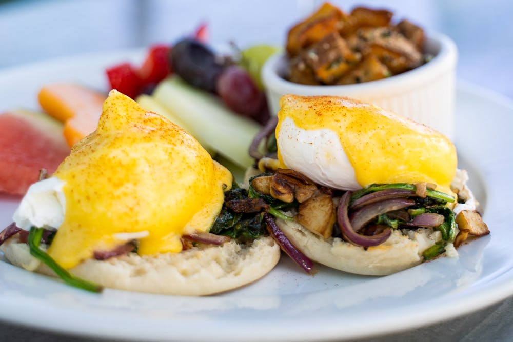 Mia Bella’s Italian Breakfast – sautéed spinach, potatoes, onions, mushrooms, and hollandaise sauce on a toasted English muffin.