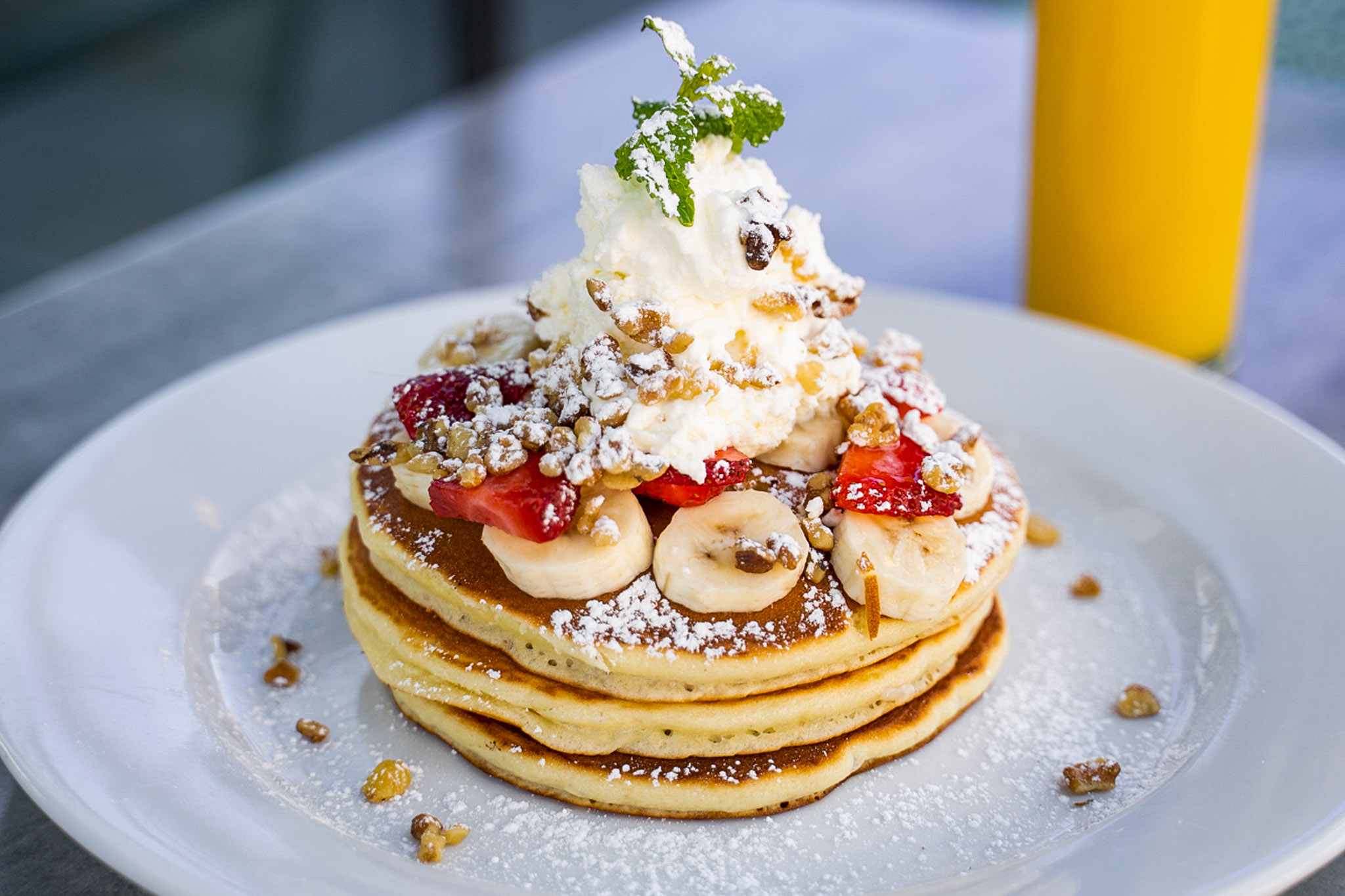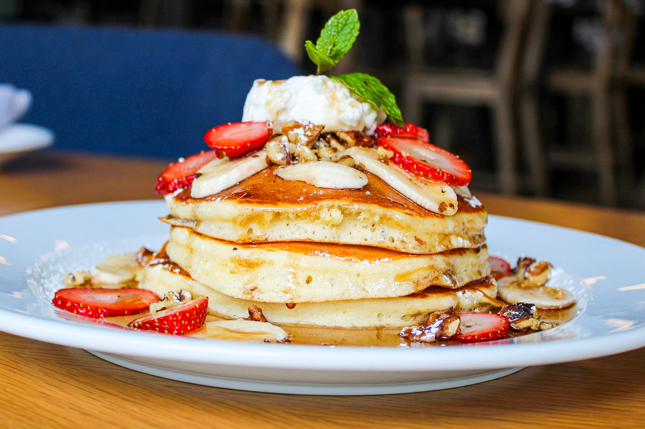 Traditional Italian Ricotta Pancakes – topped with maple syrup, banana slices, strawberries, walnuts, and a dollop of creamy ricotta.